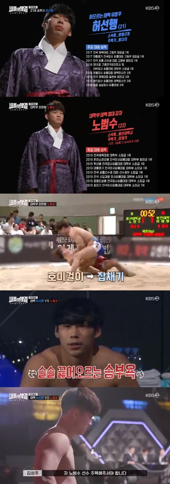 첫 대결은 SNS 화제의 씨름 스타 손희찬과 황찬섭이었다. 이들의 제15회 학산배 전국장사 씨름대회 결승전 경기 영상이 화제가 됐고 영상 속에서 이들은 화려한 기술만큼이나 화려한 미모로 주목받았다.