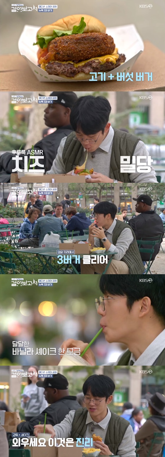이날 등장한 버거집은 뉴욕 3대 버거 중 하나인 '쉑쉑버거' 본점으로, 정해인은 "한국에서는 한 번도 안 먹어봤다"며 설렘을 드러냈다. 그는 버거 4개 외에도 프렌치 프라이와 바닐라 셰이크, 콜라를 주문한 후, 공원 내 벤치에 자리를 잡고 앉아 '먹방'을 시작했다.