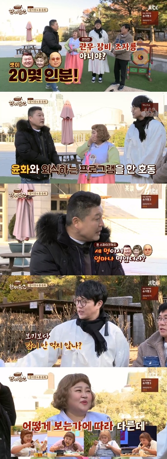 이날 규동형제는 국악 버스킹 중이던 성시경, 홍윤화와 만났다. 강호동은 "과거 홍윤화와 외식 프로그램을 같이 한 적이 있다"고 말을 꺼냈다. 이에 홍윤화는 돈 스파이크, 강호동과 함께 "20몇 인분을 먹었다"고 밝혀 눈길을 끌었다.