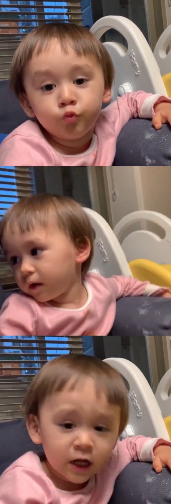 또한 엄마가 "아빠 이름은 뭐야?"라고 질문하자 "윌"이라고 대답한다. 형 이름과 헷갈렸던 것이랴. 이에 엄마가 "샘"이라고 정정해주자 힘차게, 그러나 바람 빠진 듯 "쌘"이라고 말해 귀여움을 자아냈다. 마지막으로 엄마가 "엄마 이름은? 윰 해봐"라고 시키자 "융"이라고 서툰 발음으로 최선을 다해 말했다.