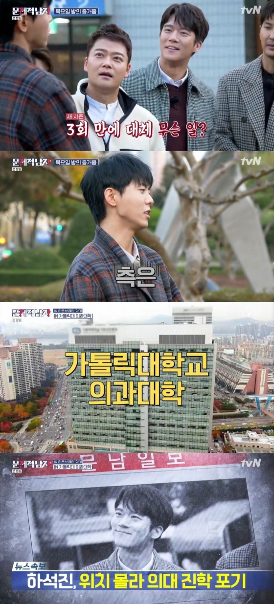 이어 하석진은 가톨릭대학교 의과대학을 바라보며 "가까운 줄 알았으면 여기 다닐 걸 그랬다. 먼 줄 알고 안 간 것"이라고 거만한 표정으로 말했다. 그러자 전현무는 "기사화 시켜주세요"라며 비웃어 웃음을 자아냈다.