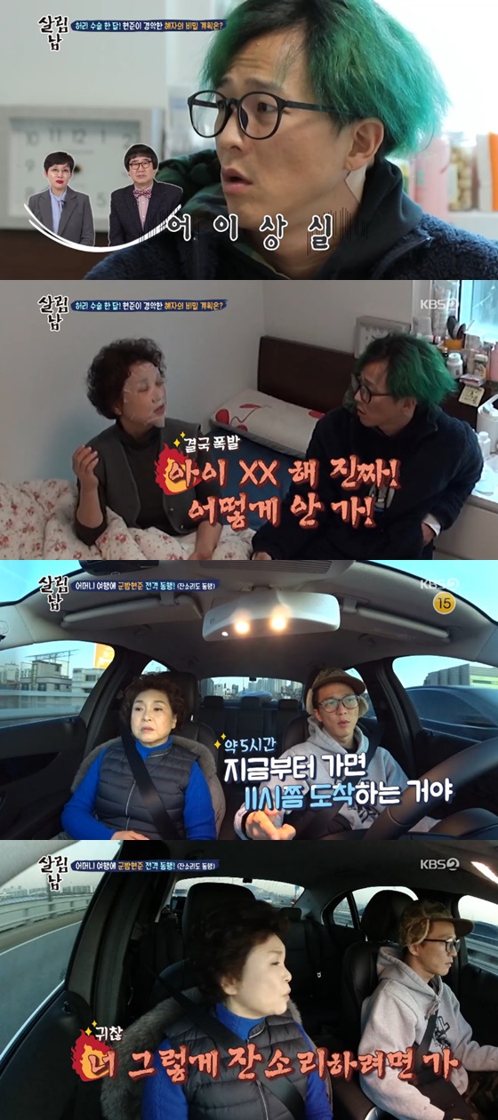 이날 팝핀현준은 허리 수술 받은 지 한 달 된 어머니에게 약을 챙겨드리다가 "경상도로 여행을 가겠다"는 말에 버럭 화를 냈다.