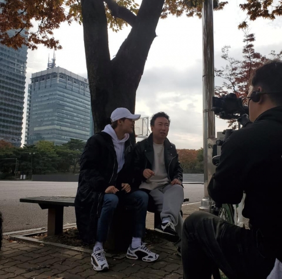 공개된 사진 속 김준수는 박명수와 여의도공원에 나란히 앉아 이야기를 하고 있다. 김준수는 지난 11일 첫 방송된 MBC 시사교양프로그램 '공유의 집'에 박명수와 함께 출연하며 케미를 자랑한 바 있다.