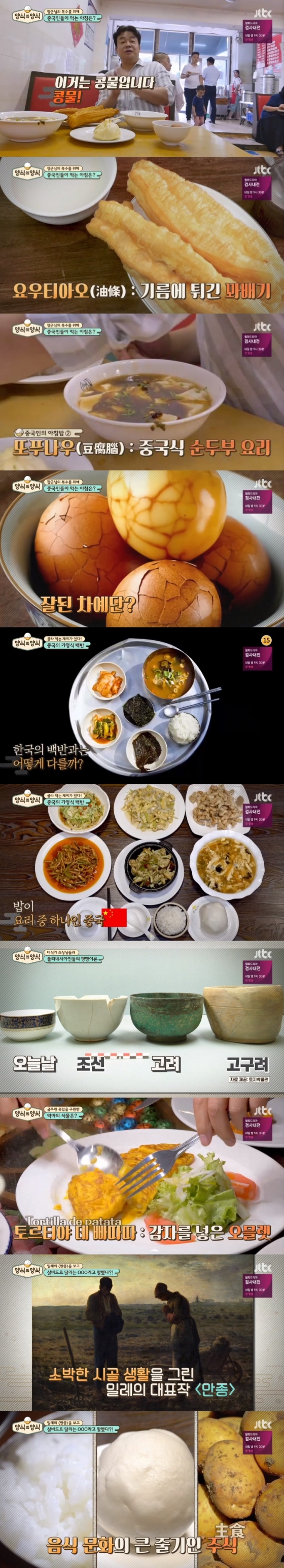 '양식' 멤버들은 옛날 사람들이 현재보다 훨씬 많은 양을 먹었다. 유 교수는 "그 때는 밥을 먹기 힘든 환경이기 때문에 많이 먹어뒀을 것"이라고 설명했다. 정 교수와 채 작가는 감자로 만든 3가지 스페인 백반 러시아 샐러드, 빠따따 리오하나, 또르티야 데 빠다따를 경험했다. 정 교수는 "감자가 과거 관상식물로 쓰이다가 뒤늦게 식용이 됐다"고 말했다. 또 밀레의 '만종'이 기근의 슬픔을 그린 작품이라고 설명했다.