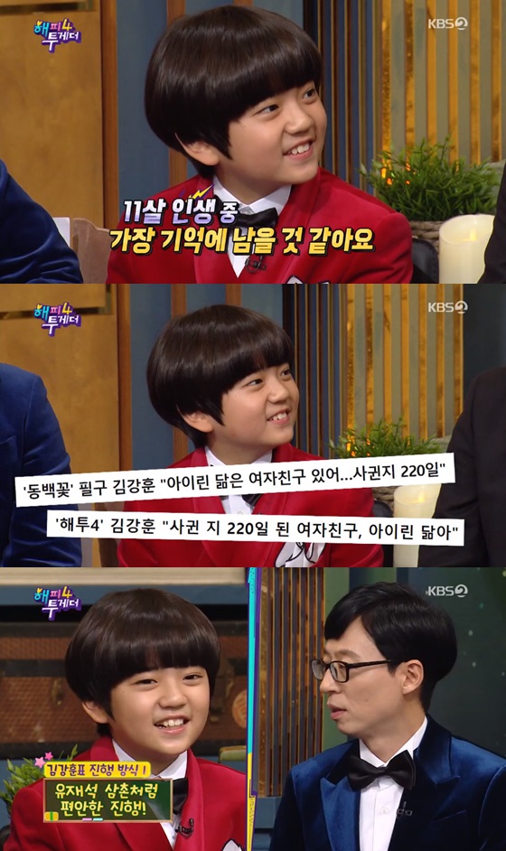 이날 방송에서 김강훈은 "친구들이랑 놀 때 진행을 많이 한다"며 귀여운 MC본능을 밝혔다. 김강훈은 지난 11월 28일 방송된 '해투4'에 게스트로 출연했던 바 있다.