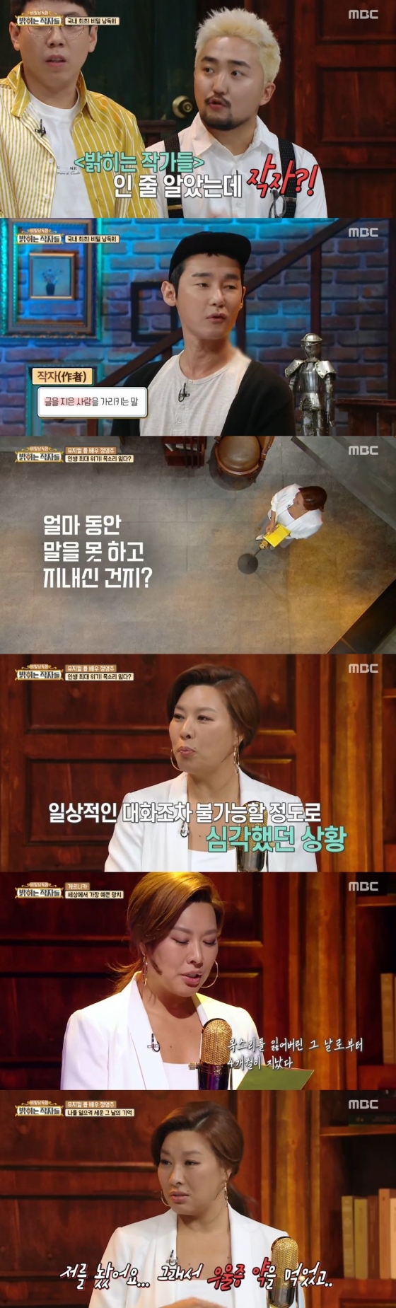 이날의 첫 번째 작자는 배우 정영주였다. 정영주는 필명으로 피카소의 작품 중 하나인 '게르니카'를 사용했다. 정영주는 2008년에 쓴 '세상에서 제일 예쁜 망치'를 공개했다. 이는 정영주가 성대 파열을 겪었던 당시에 썼던 글이었다.