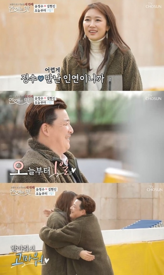 한편 '연애의 맛' 19일 방송분에서는 윤정수, 김현진의 데이트 모습이 그려졌다. 이날 윤정수는 눈썰매장에서 김현진을 위한 이벤트를 준비했다. 윤정수가 데려간 슬로프에는 '현진아 넌 웃을 때 제일 예뻐'라고 적힌 현수막이 펼쳐져 있었고, 윤정수는 김현진에게 겨울 맞이 커플 옷을 선물했다.