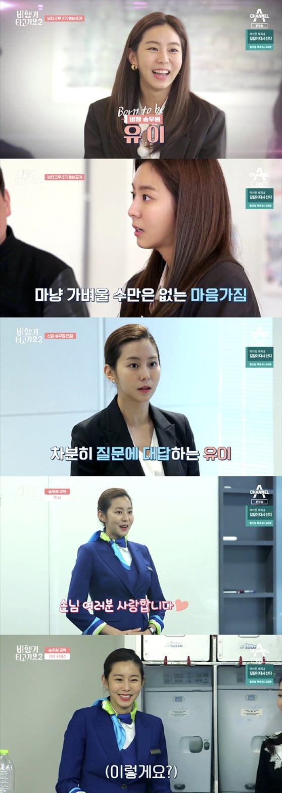 지난 21일 방송된 채널A '비행기 타고 가요' 시즌2 첫 방송에서 승무원에 도전하는 유이의 모습이 그려졌다. '비행기 타고 가요'는 기내 승무원을 꿈꿨던 연예인들이 실제 승무원 업무와 일상을 체험하는 승무원 도전 리얼 버라이어티다.