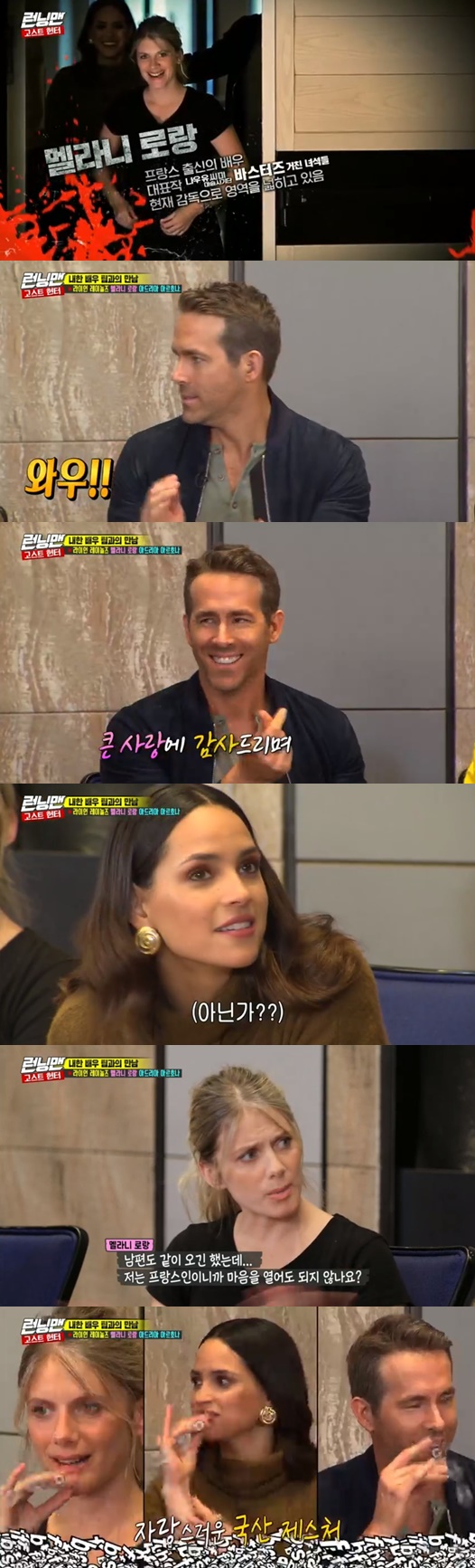 이들은 '런닝맨' 멤버들을 힘차게 허그하며 등장해 기대를 모았다. 라이언 레이놀즈는 "여기에 나오게 돼서 기쁘다. 첫번째 희생자가 되는게 기대된다"고 말했다. 아드리아 아르호나와 멜라니 로랑은 "초대해주셔서 감사하다. 제대로 준비되어 있다"고 포부를 밝혔다.