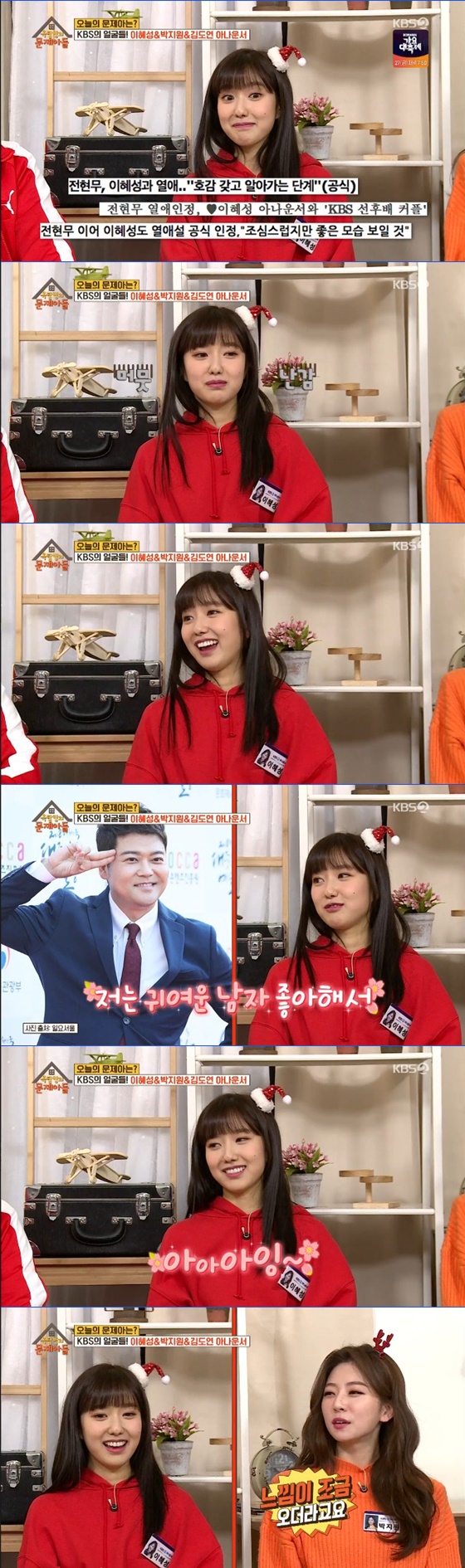 23일 오후 방송된 KBS 2TV 예능프로그램 '옥탑방의 문제아들'에서는 이혜성 아나운서가 공개 열애 중인 전현무에 대해 언급하는 모습이 그려졌다.