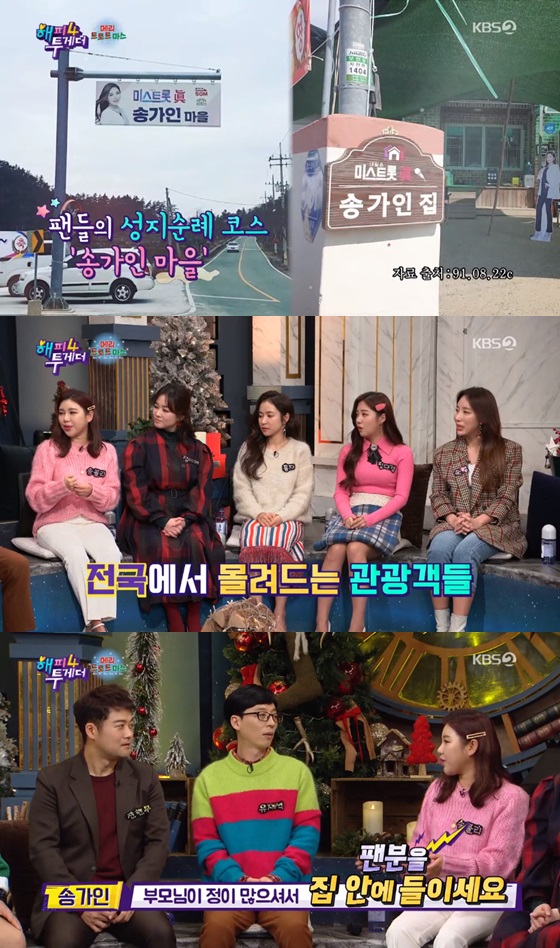 이날 방송에서 송가인은 "고향 진도 집에 송가인 마을이라고 팻말이 붙었다. 진도군의 관광지가 될 정도로 하루 2000명의 팬 분들이 방문해주고 계신다"고 전해 놀라움을 안겼다.