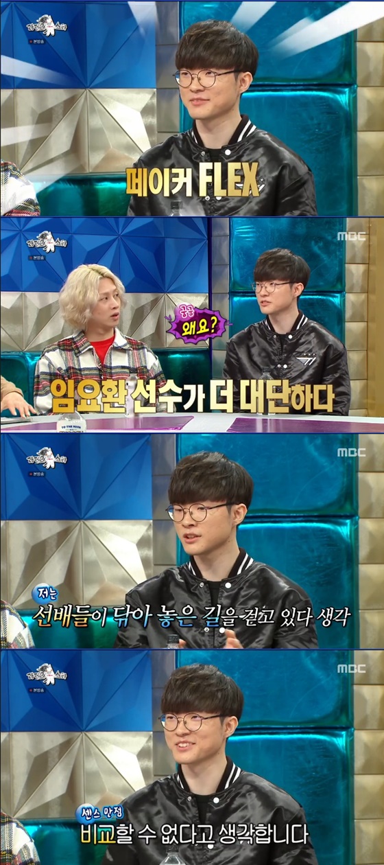 페이커는 임요환과 자신을 비교하는 질문에 "매번 비교할 수 없다고 생각한다. 제가 생각하는 기준에서는 임요환 선수가 대단하다고 생각한다. 임요한 선수는 아예 없는 길을 만들어주셨다. 전 선배들이 만들어주신 길을 가는 거다"라고 답했다. 이를 들은 김구라는 홍진호와 비교했을 땐 어떠냐고 했다. 페이커는 재치있게 "저는 비교할 수 없다고 생각한다"고 답했다.