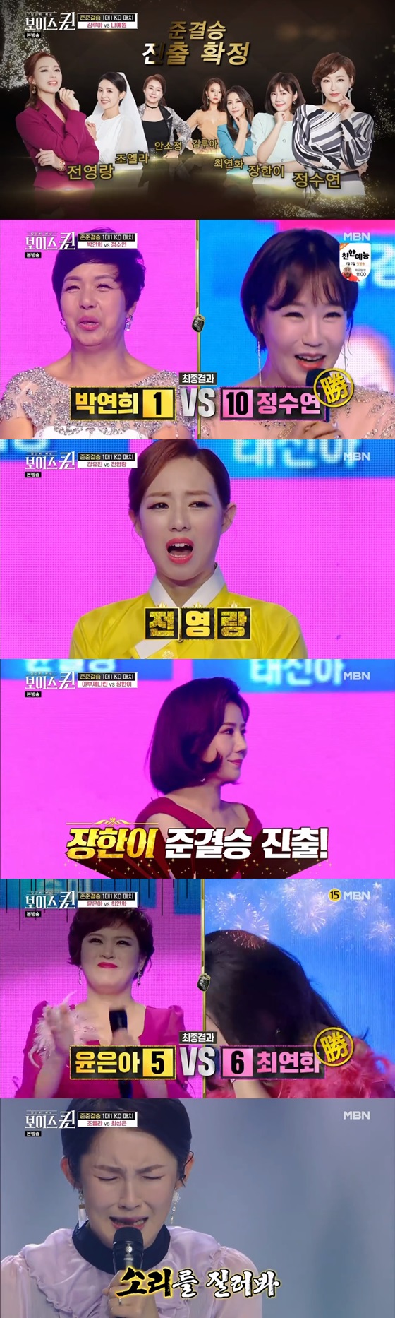 전영랑은 노란색 한복을 입고 강원도 민요 '한 오백년'을, 강유진은 스팽글을 입고 서울시스터즈의 '첫차'를 부르며 상반된 매력을 뿜었다. 무대를 본 태진아는 "강유진도 최고의 노래를 했고, 전영랑도 노래 잘하는 분이다. 두 사람 다 '보이스퀸'의 여왕이라 생각한다"며 치켜세웠다. 승리는 전영랑에게로 돌아갔다.