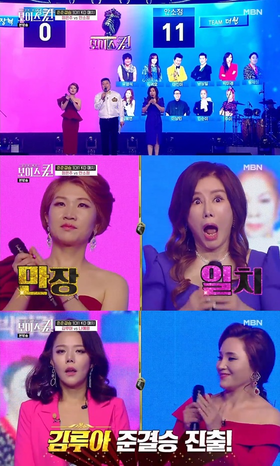 이후에 벌어진 매치들은 큰 점수 차를 보였다. 먼저 패티김 '가을을 남기고 간 사랑'을 부른 안소정은 압도적인 질주로 11대 0으로 재즈 고수 정은주를 무찔렀다. 뮤지컬 배우 출신 김루아는 마마무의 '피아노 맨'으로 댄스에도 흐트러지지 않는 탄탄한 가창력과 애드리브 실력을 선보였다. 그녀는 이은하의 '겨울 장미'를 부른 나예원을 9대 2로 이기며 준결승에 진출했다.