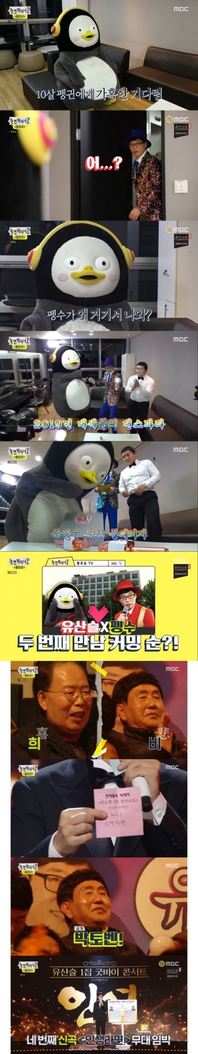 4일 방송된 MBC 예능프로그램 '놀면 뭐하니?'에서는 유산슬을 깜짝 방문한 펭수의 모습이 전파를 탔다.