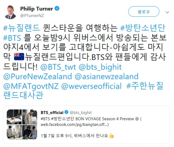 필립 터너 주한 뉴질랜드 대사가 방탄소년단 '본 보야지 4' 시청 독려와 더불어 방탄소년단(BTS RM 진 슈가 제이홉 지민 뷔 정국)과 팬인 아미(ARMY)에게 감사 인사를 건넸다.