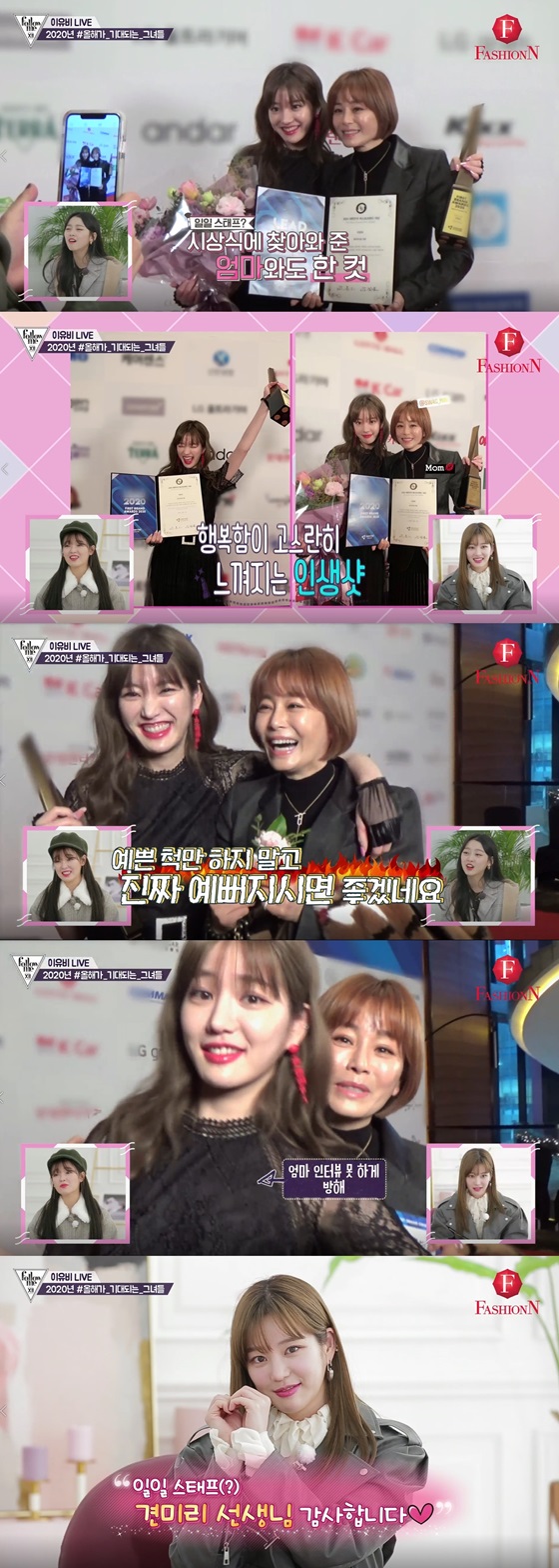 검은색 드레스를 입고 시상식 현장에 도착한 이유비는 "뷰티 아이콘으로는 저희 집에서 제가 처음으로 받았다"며 "(그래서) 이렇게 구경하러 오셨다"며 견미리를 일일 스태프로 소개했다.