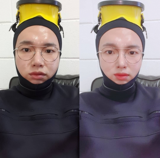공개된 사진에는 잠수복을 착용 중인 장성규의 모습이 담겨있다. 특히 어플(애플리케이션) 효과 적용 전과 후의 모습을 함께 공개해 웃음을 안겼다.