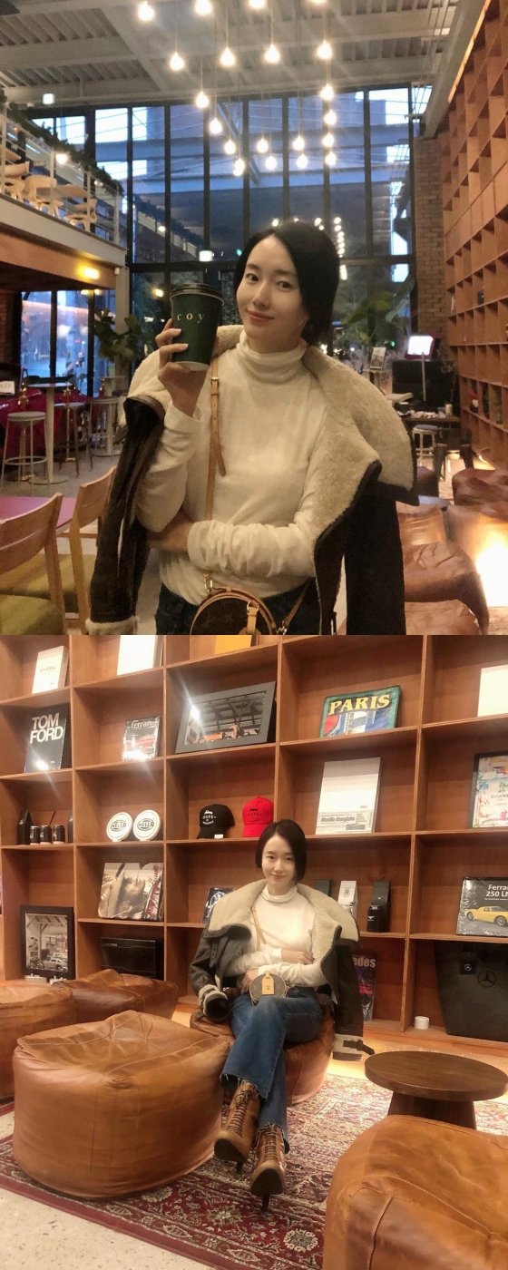 공개된 사진 속 이정현은 카페에 앉아 커피 컵을 든 채 환하게 미소 짓고 있다. 잡티 하나 없는 이정현의 눈부신 피부가 눈에 띈다.