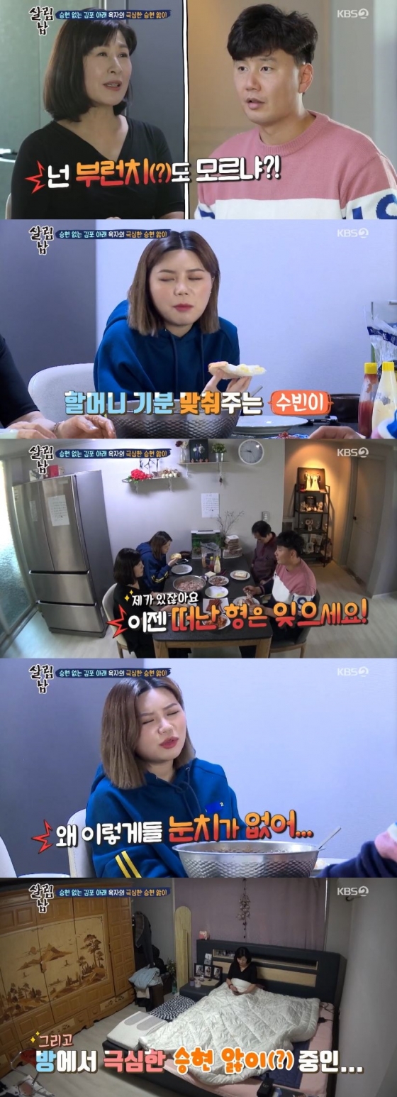 수빈은 "난 좋은데. 간편하잖아. 먹기 편하고"라며 할머니 편을 들었다. 이때 김승현 동생은 "엄마 이제 형은 떠나갔잖아요. 왜 이렇게 형 이야기를 하세요. 이제 형도 없는데 제가 장남이에요. 저한테 잘해주셔야죠"라고 투덜댔다.