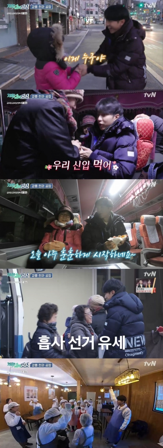 이날 '체험 삶의 공장'을 맡은 이승기는 한과 공장 체험을 위해 출근 버스를 기다렸다. 이승기는 "이번에는 출근부터 함께해서 몸과 정신의 상태를 최적화 시키겠다"며 포부를 드러냈다.