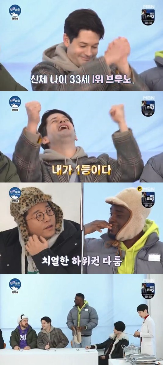 방송인 브루노가 '친한 예능' 멤버들 가운데 신체 나이 1위를 차지했다. 개그맨 김준호는 꼴찌로 굴욕을 맛봤다.