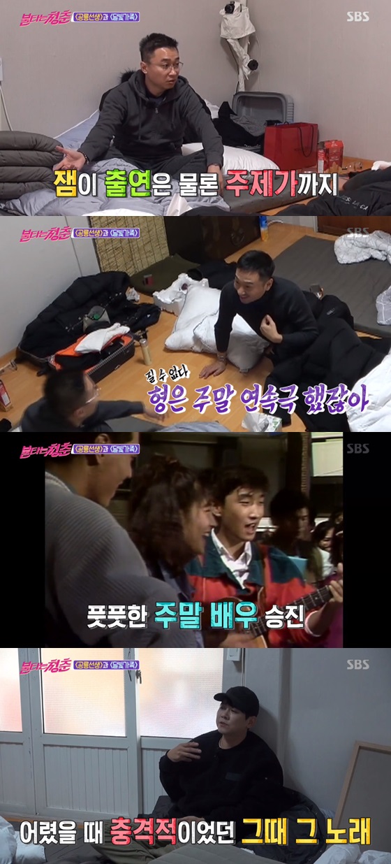 21일 오후 방송된 SBS 예능 프로그램 '불타는 청춘'에서는 그룹 잼 출신의 새 친구 조진수와 5년 만에 '불타는 청춘'에 컴백한 가수 김승진이 과거 드라마에 출연한 적이 있음을 밝히는 모습이 그려졌다.