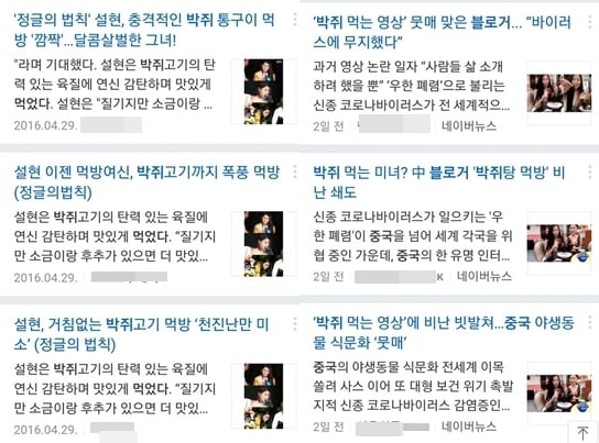 황교익은 이를 비교하며 2016년 설현이 SBS '정글의 법칙' 촬영 중 박쥐 고기 먹방을 했던 당시 기사와, 최근 중국 블로거의 박쥐 먹방 기사를 캡처해 비교해서 올렸다.