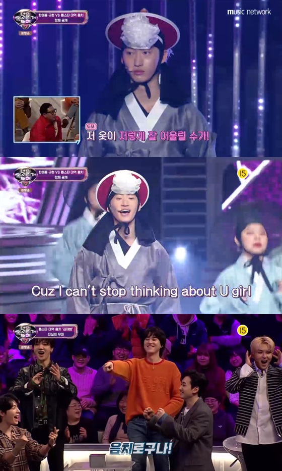 규현의 강력한 주장으로 정체를 확인받게 된 그는 상모 돌리는 복장으로 무대에 등장해 여유있게 뒷짐을 졌다. 이후 영화 '전우치'의 OST인 '궁중악사'에 맞춰 고난이도 상모 돌리기 기술을 선보여 기대감을 높였다.