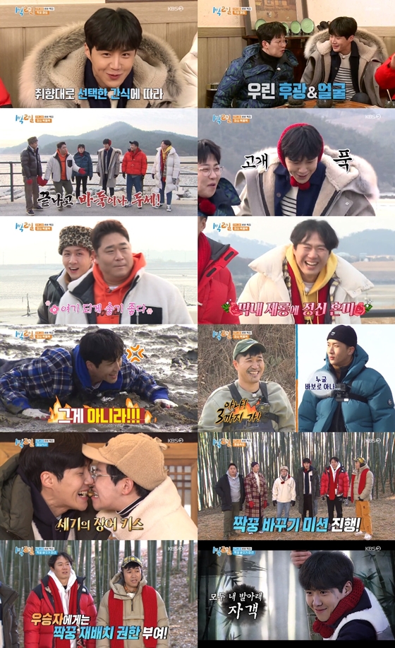 여기에 점심이었던 장어를 얻어먹기 위해 고군분투하는 모습으로도 웃음을 더했다. '풍천장어' 4행시로 김종민에게 어렵사리 장어 한 조각을 하사받은 김선호와 딘딘은, "입으로 반씩" 나눠 먹으라는 그의 요구에 의도치 않게 설렘 가득한 '장어 키스' 장면을 연출하며 안방극장을 폭소케 했다.