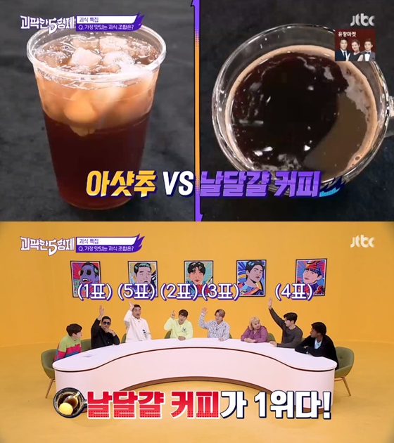6일 오후 방송된 JTBC 예능프로그램 '괴팍한 5형제'에서는 가장 맛있는 괴식 커피의 순위를 꼽는 김종국, 박준형, 서장훈, 이진혁과 게스트 한현민, 오스틴, 토니안, 홍윤화의 모습이 그려졌다.