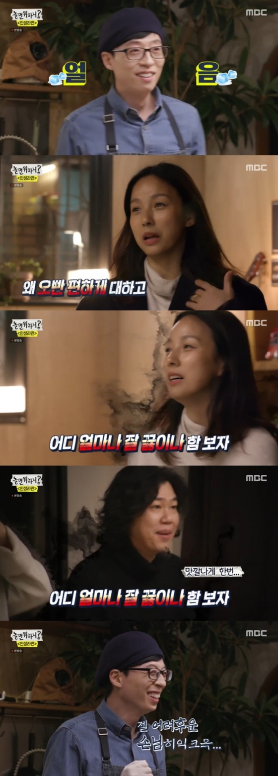 이날 유재석의 '인생라면' 가게에는 예약 손님 이효리, 이상순 부부가 방문했다. 이효리는 베레모를 쓰고 앞치마를 걸친 유재석의 모습을 보고 "멋있는 척 하고 있어"라며 놀랐다.