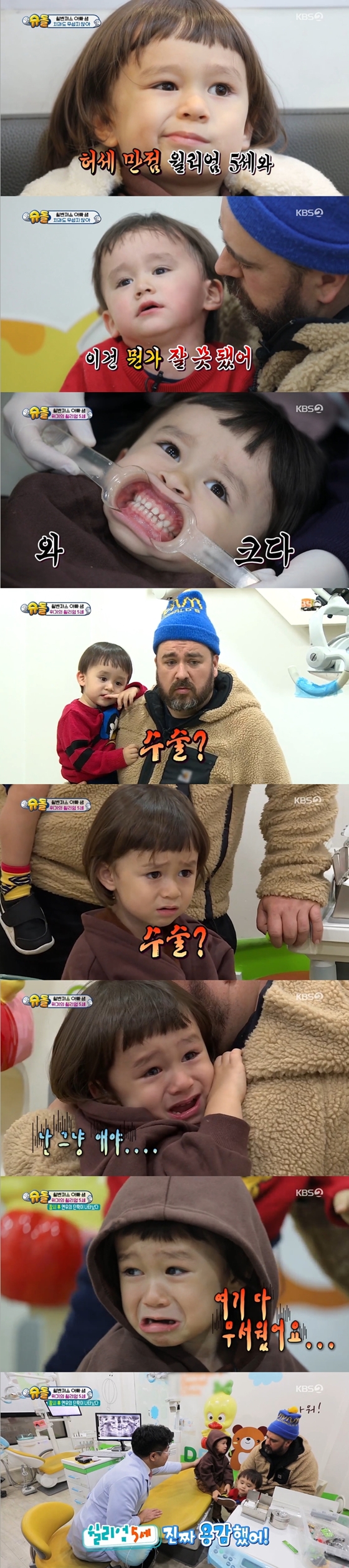 이날 방송에서는 다섯 살이 된 윌리엄의 허세 가득한 치과 방문기가 그려지며 웃음과 눈물을 동시에 선사했다. 새해를 맞이해 다섯 살이 된 윌리엄은 형 부심을 뽐내며 허세를 부렸다. 이를 본 샘 아빠가 윌리엄에게 "왜 이렇게 허세를 부리냐"고 묻자, 윌리엄은 "허세가 아니고 5세"라며 "난 윌리엄 5세"라고 말했다.