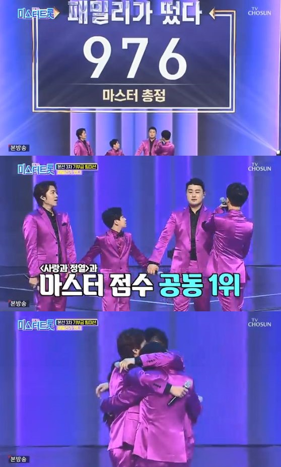 '내일은 미스터트롯'에서 패밀리가 떴다(김호중 고재근 정동원 이찬원) 팀이 감동적인 무대로 마스터 점수 공동 1위에 등극했다.