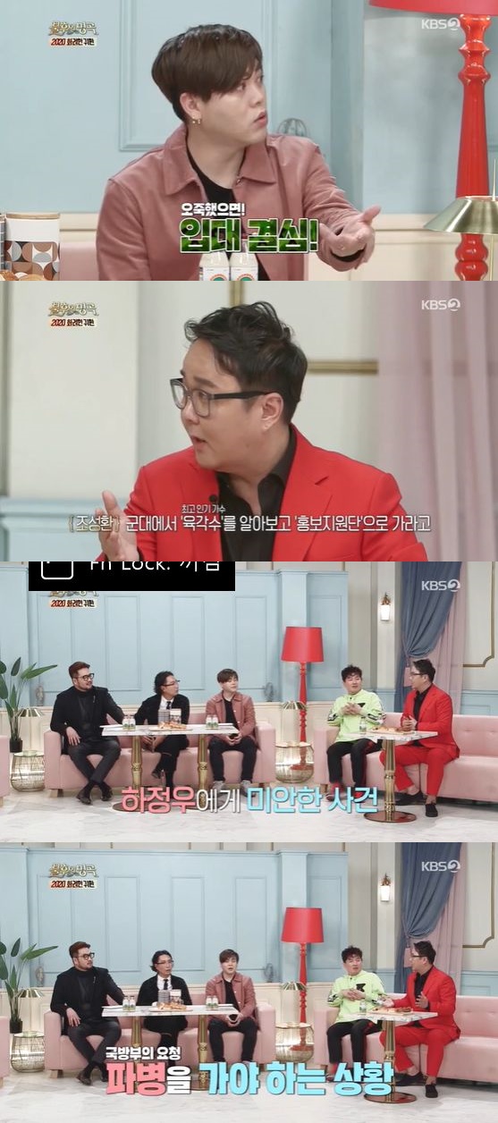 육각수는 "사실 하정우에게 미안한 사실이 있다"며 MC들의 궁금증을 자아냈다. 육각수는 "당시 스케줄이 너무 바빠 힘들어서 입대신청을 할 정도였다. 군에서 연예병장으로 가수 하림, 배우 하정우, 개그맨 강성범 등이 있었다"라며 군 에피소드를 풀었다.