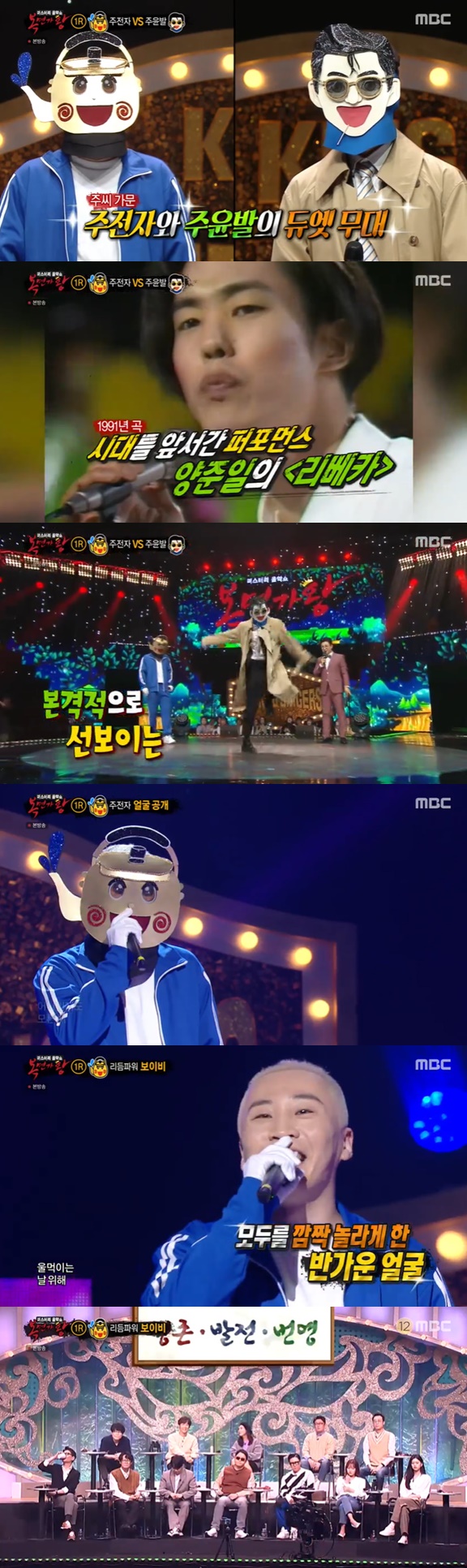 1라운드 마지막 대결로는 '주전자'와 '주윤발'의 무대가 전해졌다. 두 사람은 조용필의 '단발머리'를 부르며 기교 넘치는 창법을 과시했다. 이어진 개인기 시간에서 '주윤발'은 양준일의 '리베카' 댄스 오마주로 시선을 사로잡았다. 김구라는 "신화의 전진 느낌이 난다"고 추측했다. 77표 대 22표로 주윤발이 승리하고 2라운드에 진출했다. 전람회의 '꿈속에서'를 부르며 얼굴을 공개한 '주전자'의 정체는 힙합그룹 리듬파워의 보이비였다.