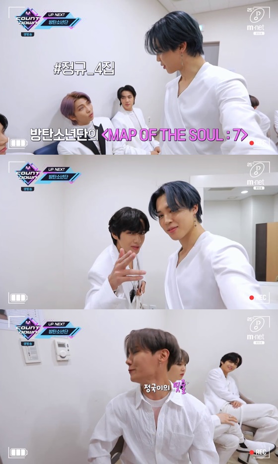27일 오후 방송된 엠넷 음악순위 프로그램 '엠 카운트다운'에서는 방탄소년단이 국내 최초 4집 컴백 무대를 앞두고 대기실에서 밀착 인터뷰를 하는 모습이 그려졌다.