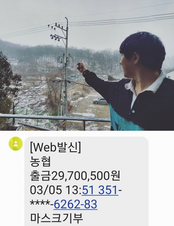 공개된 사진 속에는 기안84가 1만 장의 마스크 기부를 위해 3000만원 상당을 출금한 문자 메시지 캡처가 담겨 있다. 이어 어제 눈이 온 날씨를 인증하듯 눈을 맞은 사진도 공개했다.