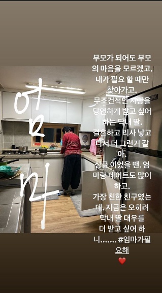 이어 "결혼하고 리사 낳고 나서 더 그런 거 같아. 싱글이었을 땐 엄마랑 데이트도 많이 하고 가장 친한 친구였는데. 지금은 오히려 막내딸 대우를 더 받고 싶어 하니.. #엄마가 필요해♥"라는 글과 함께 사진을 게재했다.