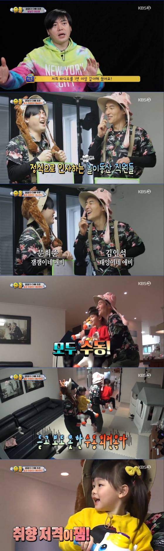 그러나 잼잼이와 태양이를 플라스틱 말에 태우고 수동으로 움직이는 것은 쉽지 않았다. 그러나 직접 안무와 노래도 준비하며, 아이들을 장난감 말에 태운 뒤 수동 회전목마를 태워줬다. 이어 의자를 이용한 허술한 자이로드롭도 선보였으나 아이들의 반응은 차가웠다.