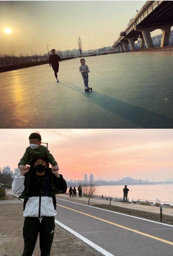 장성규는 11일 자신의 인스타그램에 "지난 주말 이틀간 한강에 갔다. 쉬지 않고 뛰놀던 하준이. 뛰는 걸 이렇게 좋아하는데 집에만 있어야 하는 요즘을 내가 물려준 것만 같아 미안했다. 그래도 하준아, 아빠 잘 만났으니 그걸로 퉁치자"라는 글과 함께 2장의 사진을 게재했다.