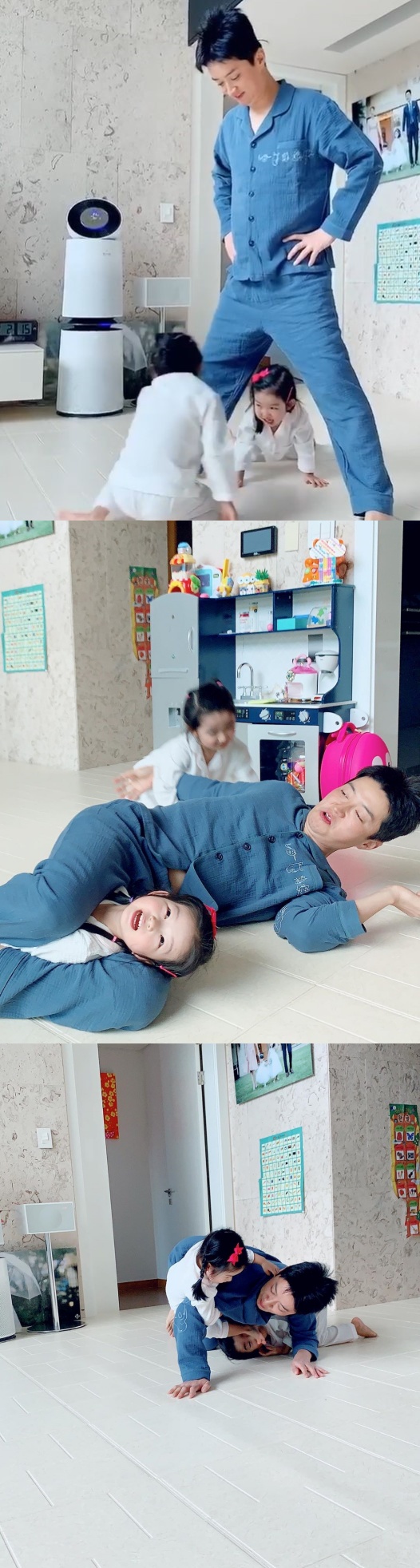 공개된 사진 속 인교진은 두 딸 하은-소은 양과 함께 놀아주고 있다. 파자마를 입고 다정하게 두 딸과 놀아주는 모습이 훈훈함을 자아낸다.