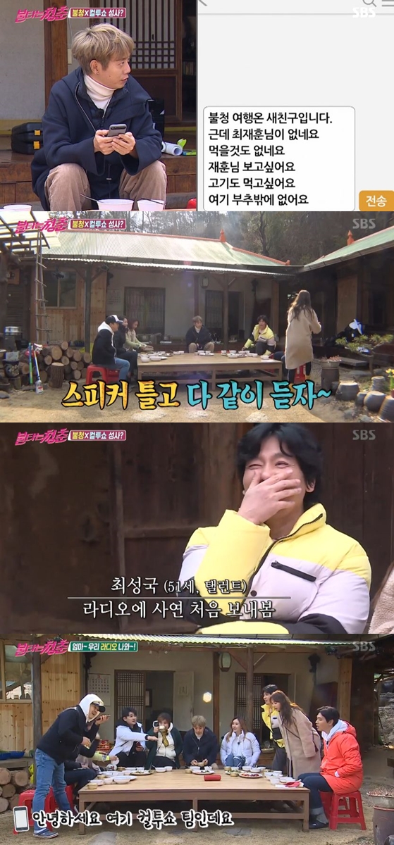 '불타는 청춘' 멤버들은 최재훈이 '컬투쇼'에 출연한다는 말을 듣고 다 같이 라디오를 청취하다 참여 문자를 전송했다.