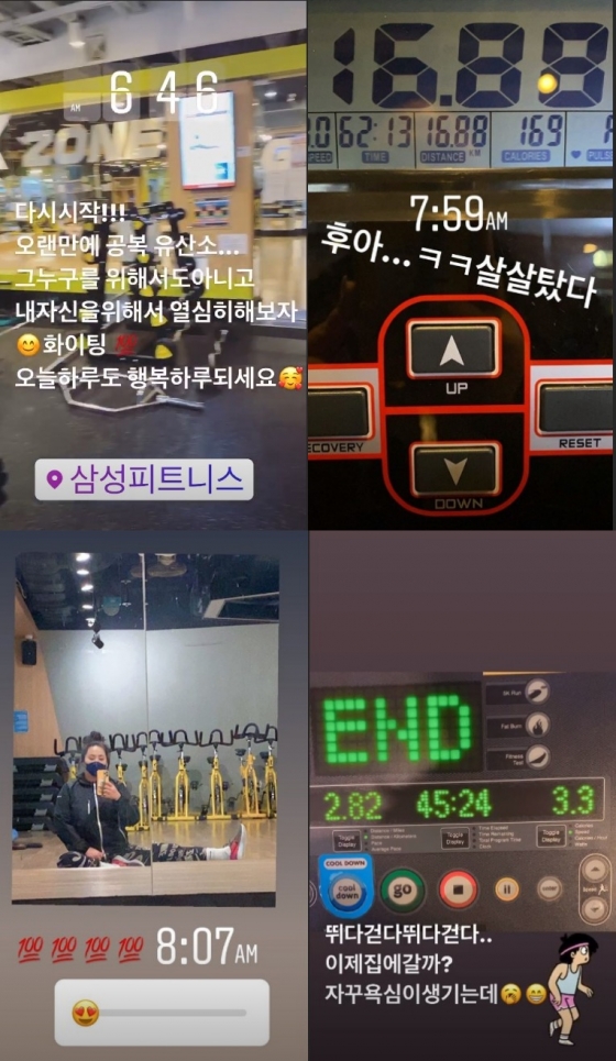 이어 "뛰다 걷다 뛰다 걷다.. 이제 집에 갈까? 자꾸 욕심이 생기는데"라며 러닝머신에 기록된 시간을 공개했다.