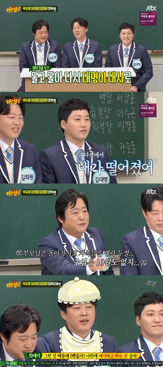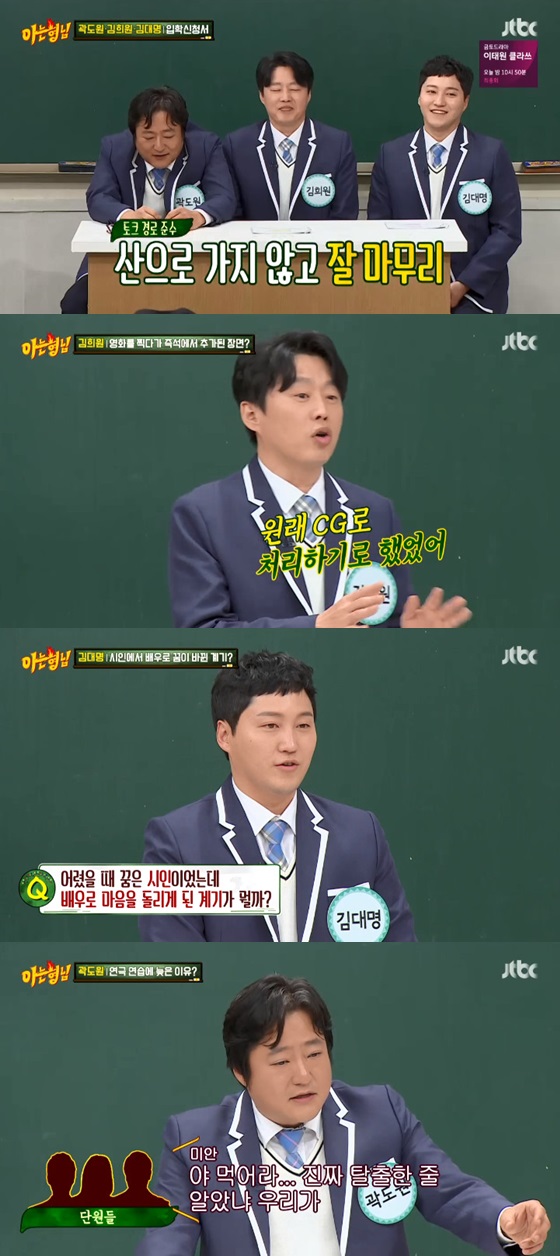 21일 방송된 JTBC 예능 프로그램 '아는 형님'에는 영화 '국제수사'에 함께 출연한 배우 곽도원 김대명 김희원이 전학생으로 등장했다.