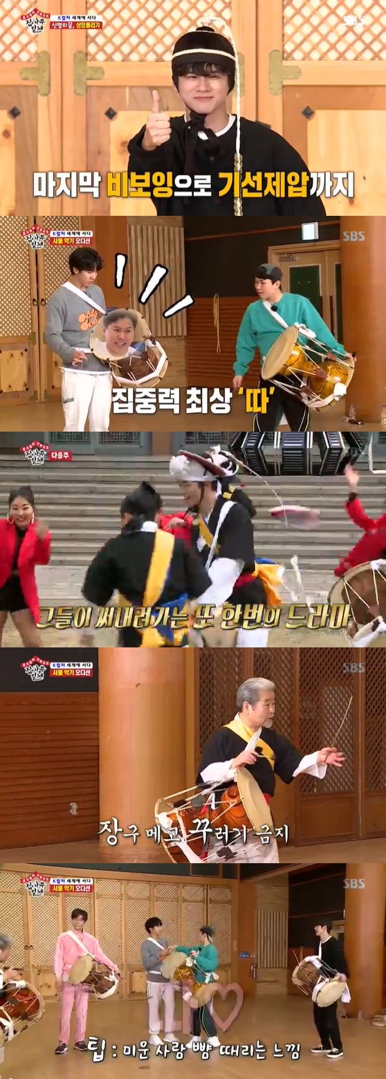 장구를 다룰 때 멤버들이 '따'소리를 내는 데에 어려움을 겪자 김덕수는 "미운 사람 따귀를 때리는 느낌으로 치면 된다"라고 말하며 재치를 발휘했다. 이에 이승기와 양세형은 서로를 바라보며 장구 치는 기술을 습득해 예능감을 드러냈다.