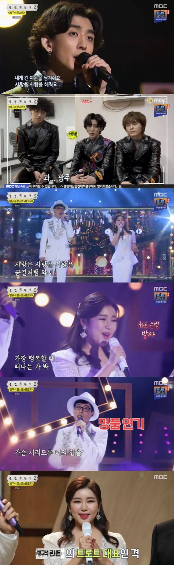 28일 오후 방송된 MBC 예능프로그램 '놀면 뭐하니'에서는 코로나19로부터 셀프 거리 두기를 실천 중인 '집콕족'을 위한 봄밤 뮤직 페스티벌 '방구석 콘서트' 2편이 전해졌다. '방구석 콘서트'는 지난주 장범준, 뮤지컬 '맘마미아', 지코, 이승환에 이어 이번주 유산슬, 송가인, 잔나비, AOMG 무대가 펼쳐졌다.