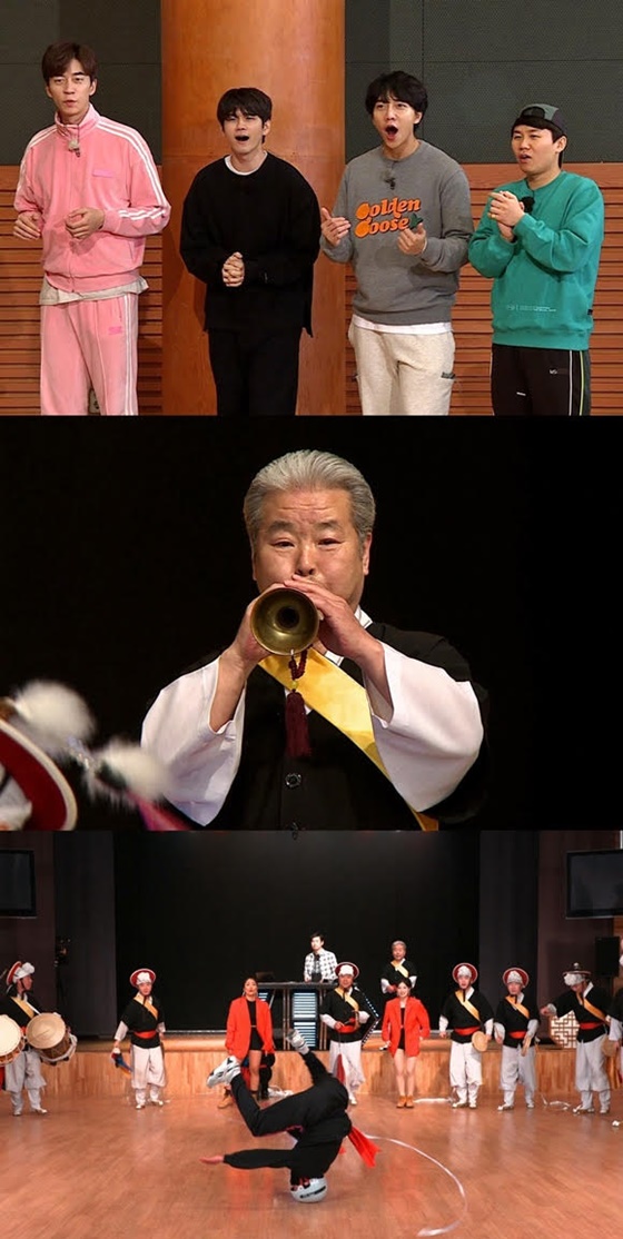 이날 멤버들과 일일 제자 옹성우는 '사물놀이 창시자' 김덕수 사부와 함께하게 됐다. 이들은 한국의 사물놀이를 전 세계에 알릴 역대급 공연을 예고했다. 사물놀이에 비보잉, 힙합 등 다양한 장르를 접목, 장르는 물론 국경마저 허물어뜨린 컬래버레이션 공연을 준비한 것.