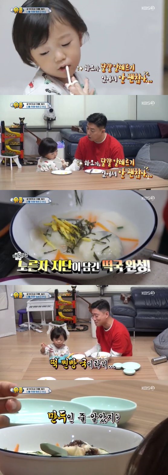 29일 오후 방송된 KBS 2TV 주말 예능 '슈퍼맨이 돌아왔다' (이하 '슈돌')에서는 강개리가 아들 강하오의 달걀 알레르기를 극복하기 위해 메추리알 프라이를 넣은 요리를 준비했다.