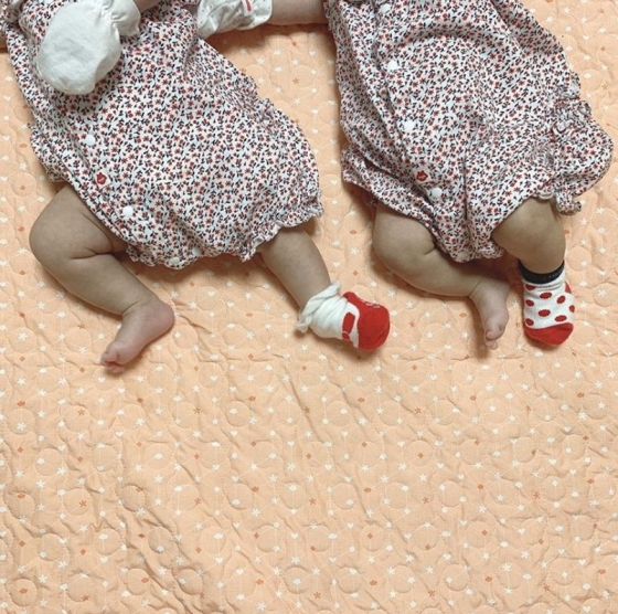 공개된 사진 속에는 율희의 쌍둥이 자녀 아린, 아윤 양이 담겨 있다. 아린, 아윤 양의 조그마한 발이 귀여움을 자아낸다.